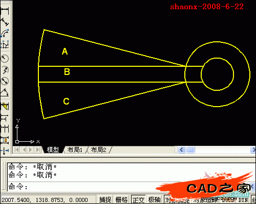 如上圖,我們要對扇形做拉升,按常規,需做成A、B、C三個面域,再合并成一個面域。如嫌麻煩,還有一便捷方法。