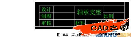 (6)重復(fù)上一步的操作,在標(biāo)題欄內(nèi)添加其他文字,如圖10-8。注意,其中“軸承支座”字體高度為6,其他均為5。