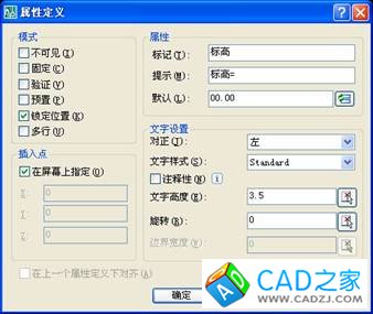 二、操作菜單“繪圖”→“塊”→“定義屬性”,或者直接運(yùn)行命令“attdef”,在“定義屬性”窗口里的“標(biāo)記”內(nèi)輸入“標(biāo)高”,在“提示”內(nèi)輸入“標(biāo)高=”,在“默認(rèn)”內(nèi)輸入“00.00”,“文字高度”用3.5,按“確定”關(guān)閉窗口。