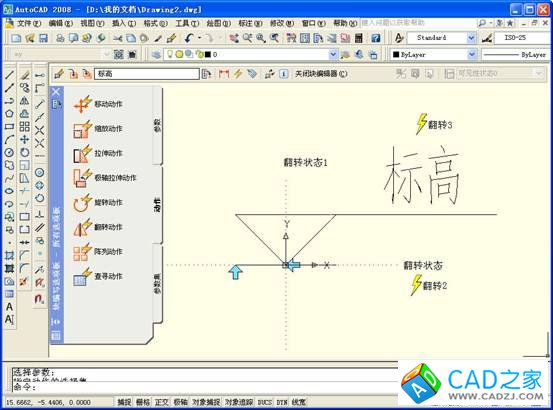 在“塊編寫選項(xiàng)板”的“動作”選項(xiàng)卡里再次點(diǎn)擊“翻轉(zhuǎn)動作”,AutoCAD底部的命令窗口提示“選擇參數(shù)”,點(diǎn)擊圖上的文字“翻轉(zhuǎn)狀態(tài)1”(就是垂直的鏡像軸);命令窗口接著提示“選擇對象”,依次點(diǎn)擊三角形上方的長橫線和屬性(此時(shí)屬性顯示的是“標(biāo)高”兩個字)后回車;命令窗口又提示“指定動作位置”,拖動鼠標(biāo)到附近空白處點(diǎn)擊。