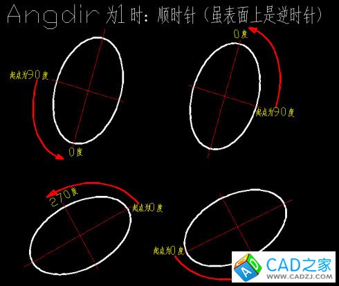 若先繪出的是短軸的起點(diǎn)的話,則從該起點(diǎn)按逆時(shí)針方向到長(zhǎng)軸的第一個(gè)端點(diǎn)處為0度。也即若此時(shí)Angdir命令為0(逆時(shí)針),則此短軸的起始點(diǎn)為270度。而若Angdir命令為1(順時(shí)針),則此短軸起點(diǎn)這90度。