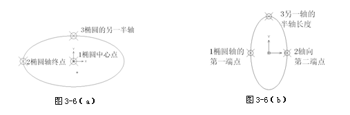 圖3-6(a)是以橢圓中心點為橢圓圓心,分別指定橢圓的長、短軸;圖3-6(b)是以橢圓軸的兩個端點和另一軸半長來繪制橢圓: