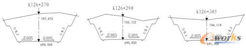 根據(jù)縱曲線數(shù)據(jù)計(jì)算出K126+270、K126+290、K126+305斷面的中樁高程為分別為690.000、690.800、691.400。K126+270斷面的標(biāo)準(zhǔn)圖形根據(jù)點(diǎn)位坐標(biāo)(100,690.000)在CAD中按照路面橫坡往兩側(cè)繪制路基線,然后在兩側(cè)將邊坡線連接在路基的兩邊。如果后面的斷面與本斷面也是相同的話,使用CAD中的Copy命令進(jìn)行復(fù)制。方法是在文本窗口中:選擇所有線形,回車確認(rèn)后在“指定基點(diǎn)或位移”時我們將基點(diǎn)選擇在(100,690.000),對于后面的“指定位移的第二點(diǎn)或 <用第一點(diǎn)作位移>:”時輸入(300,690.800)回車后繼續(xù)輸入(500,691.400)。這樣K126+290、K126+305的標(biāo)準(zhǔn)斷面就成了m.super-win.com.cn CAD之家。