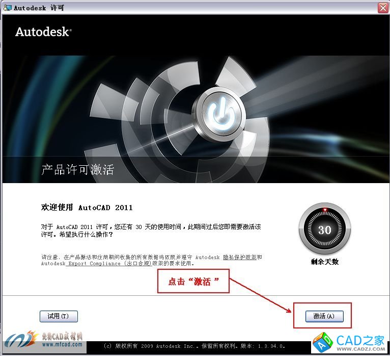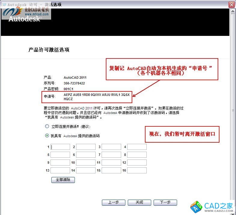 3、打開AutoCAD2011,點擊”激活“,復制“申請號”。