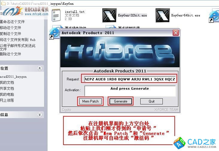 5、將復制的“申請號”粘貼至注冊機的“Request”一欄內。點“Generate”,然后將"Activation“欄內的序列號復制。