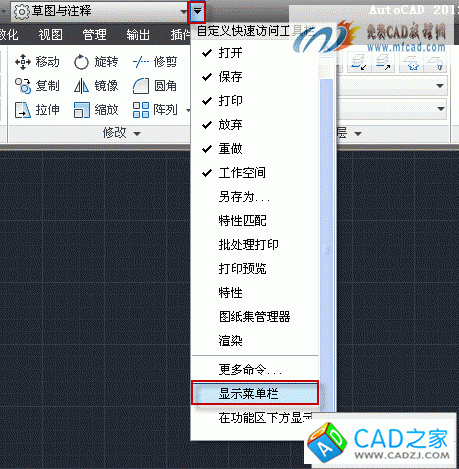 2、autocad2010及其以后版本的菜單欄可能沒有顯示出來,可以通過點擊工作空間右側的小箭頭,然后選擇【顯示菜單欄】調出菜單欄,如下圖所示