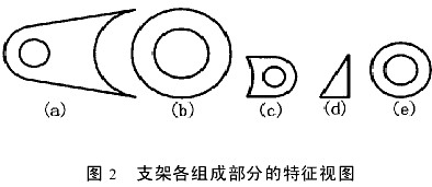 ??? 在五個(gè)組成部分中,其特征視圖在俯視圖2中有:(a)、(b)、(c);特征視圖在主視圖2中有:(d)、(e)。