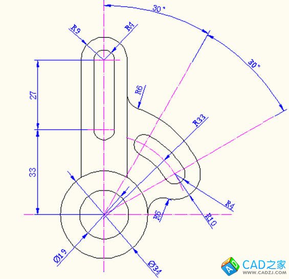 繪圖步驟:建立三個圖層,分別為繪圖、尺寸標注、輔助線圖層,通過相應尺寸和旋轉角度畫出各條輔助線,畫左下兩同心圓和上部的三個圓利用正交模式和對象捕捉中的切點畫出四條豎直直線,修剪多余線段;畫出R33的輔助線,定位出各個圓心坐標完成兩圓和兩段圓弧相切的曲線圖形(右里面的圖形),修剪多余線段;作R10的圓,再作R6的圓與兩圓相切,作一大圓與R10的圓外切,再完成其他圓弧的相切,修剪多余線段;最后進行尺寸標注。