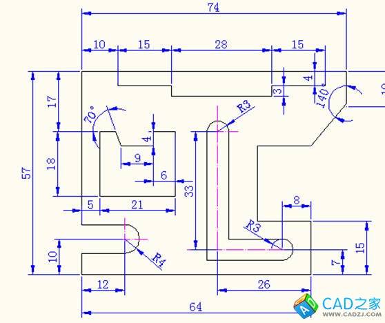 繪圖步驟:建立三個圖層,分別為繪圖、尺寸標注、輔助線圖層,先畫出輔助線,再由相關尺寸畫出外框,再通過坐標計算確定里面圖形的起點坐標(5,22)依次畫出各線段,先畫兩圓再畫與之相切的直線再修剪即可;最后進行尺寸標注。