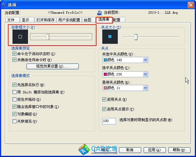 選擇拾取框可以在“選項”對話框的“選擇集”選項卡中拖動“拾取框”滑塊來調整大小,如下圖所示。