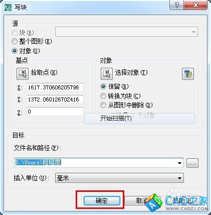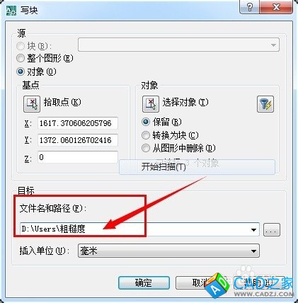 在“文件和路徑”編輯框內指定文件名和保存塊或對象的路徑。