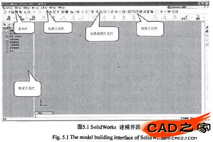 創(chuàng)新的、易學易用的SolidWorks是Windows原刨的三維設計軟件。其易用和友好的界面,能夠在整個產(chǎn)品設計的工作中,SolidWorks完全自動捕捉設計意圖和引導設計修改。如圖5.1所示為SolidWorks的建模界面。Solidworks 2007的操作界面有兩個窗格,左邊窗格包括特征管理器(FeatureManager)、屬性管理器(PropertyManager)、配置管理器(CorLfigurationManager)、自定義的第三方插件[51]。