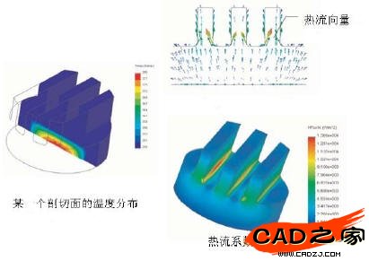 散熱片的溫度場如圖15所示。散熱片的散熱可以通過熱流向量顯示(圖15,右)。熱流向量離開散熱片進入到周圍的流體環(huán)境中.沒有向量通過底部的表面,因為在模型中散熱片的底面和芯片都是絕熱的。