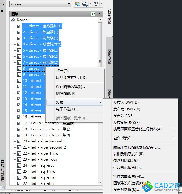 1. 比較正規(guī)的方法是,建立一個圖紙集。在圖紙集中,可以把一個項目的若干個dwg文件包含進來,而每個dwg文件可以選擇其中的全部或部分布局。在圖紙集中,可以選擇發(fā)布到繪圖儀、發(fā)布為PDF文件(2010前的版本需系統(tǒng)安裝有PDF打印機)、發(fā)布為DWF文件,如圖1。當然也可只選擇圖紙集中的一個或若干個布局來發(fā)布(批處理打印),如圖2。用圖紙集的方法不必打開dwg文件即可進行批處理打印。