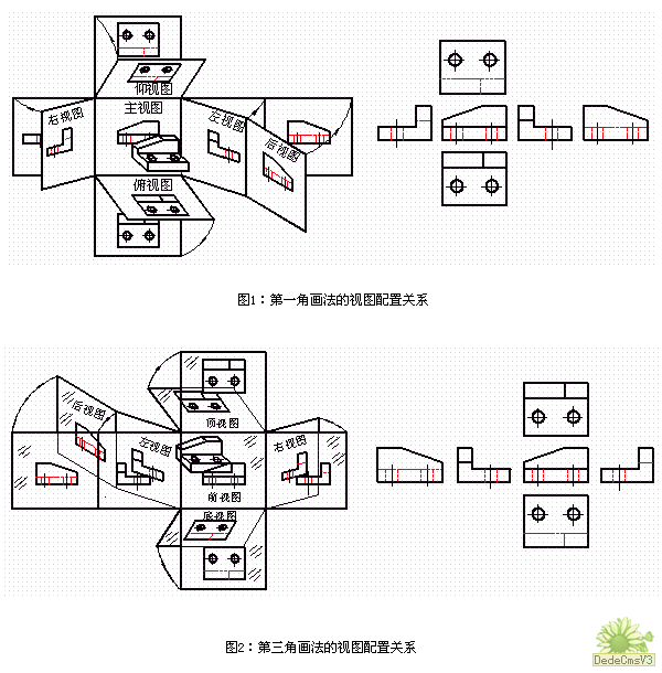 第三角法視圖畫法:投影面位于觀察者與物體之間,這樣個視圖的配置關系是:主視圖在中,左視圖在左,右視圖在右,俯視圖在上,仰視圖在下,后視圖可配置在最右也可以配置在最左. 如下圖: