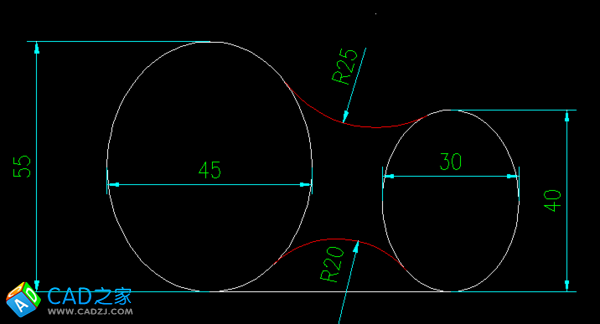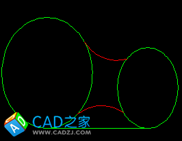 兩個橢圓不能用相切相切半徑來畫紅色的圓弧,只能用倒圓角的辦法來做