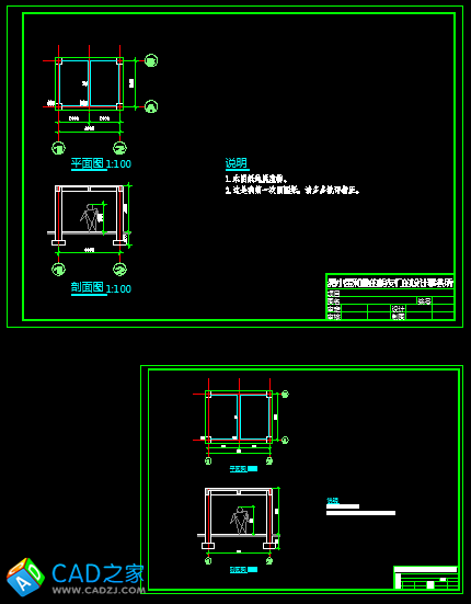 但是在「CAD 的虛擬模型空間」里,這兩張圖紙的對比是這樣的。上面的是A4的1比100的圖紙,下面的是A3的1比50的圖紙。這兩張圖紙唯一相同的地方就是小房子是一樣大的。剩下的文字高度、標注尺寸的大小、標題的大小、圖簽的大小這些東西,下面的統統都縮小了兩倍。