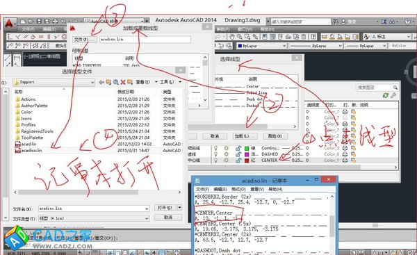 5.更改中心線的線型來符合國標,步驟如下:線型-加載-文件-記事本打開-找到相應線型,輸入數(shù)字更改