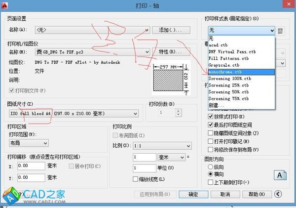 6.打印出圖的時候,只要在monochorme.ctb選上就是黑白打印了,不需要再更改顏色,如果不選,而圖層中含有黃色是基本上打印不出來的,并選擇full bleed,就是全圖幅打印,并不需要再去特性里更改
