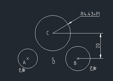 已知圓A,B,畫圓C,圓心在圓A,B的中點偏移20mm處,半徑為4.43π