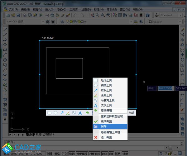 1.打開cad中的圖形,用QQ截圖功能,快捷鍵ctrl+alt+a功能,選擇圖形區域,在圖形上鼠標右擊,保存,取名,確定。(如下圖)
