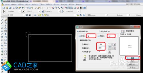 4、選擇圓形后空格回到陣列,這里說明一下行是要在這個圓有多少個,這里是兩個就輸入兩個,列也是一樣。這里的行偏移的是-500、列偏移是800。500是寬800是高,都輸入之后單擊確定。