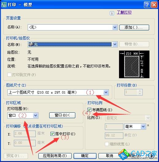 3、居中打印前打勾可使,圖紙在紙張上劇中打印