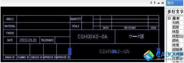 第二種方式是通過做塊來實現。首先也是通過繪制線段和文字的方法,把表格的基本內容做出來,下圖中藍色部分。然后需要在標題欄里填寫的內容,用塊屬性的方式制作,下圖白色部分。最后把這些全部制作成一個塊對象,這樣標題欄就是一個整體的對象,所以這樣做比第一種方式要好一些。但是做成塊后,要想改一些東西,如增加一欄等,就需要改整個塊的。