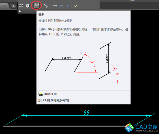 方法:用“傾斜”命令,如圖所示,或者命令行輸入“DimEdit”,輸入?yún)?shù)o(傾斜),再輸入傾斜角度即可。
