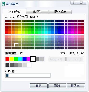2、在“選擇顏色”對(duì)話框中有“索引顏色”、“真彩色”和“配色系統(tǒng)”三個(gè)選項(xiàng)卡,可以根據(jù)需要選擇合適的顏色,然后單擊“確定”,返回到“圖層特性管理器”對(duì)話框。