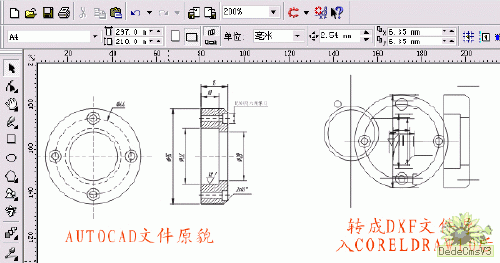 *.DXF等格式的文件,但我曾嘗試過,效果不理想。就算是AutoCAD標準的圖形交換格式文件(*.DXF文件),導入Coreldraw中效果也不是很好,很難保持AutoCAD文件的原貌,有時 甚至面目全非,如圖1。這時你總不能用Coreldraw再一點點的描吧?如果轉成位圖格式導入,效果也不好,且文件體積太大。