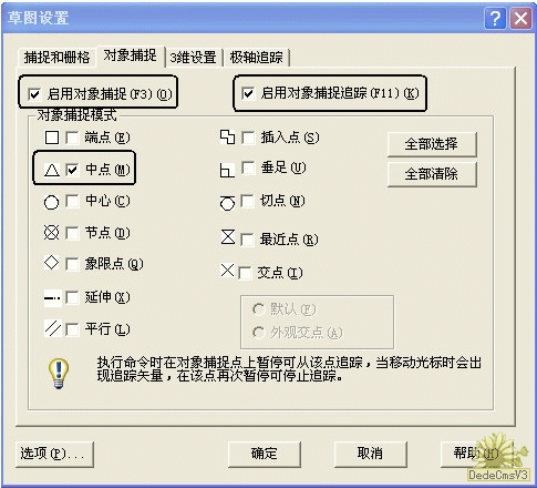 2、 把中心點捕捉、延伸捕捉打開,同上個例子的步驟1,只是把中點捕捉換成中心點捕捉和延伸捕捉。