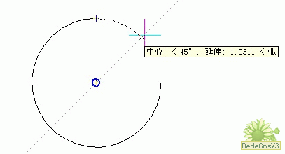 3、 啟動畫線命令,移動光標到圓弧的一端拉出延伸線,再移動光標到圓心拉出45度追蹤線,兩線交點即是要拾取點: