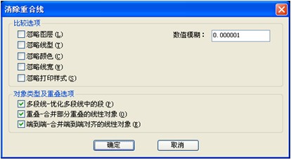 從對(duì)話(huà)框可以看出,此功能默認(rèn)只處理圖層、線(xiàn)型、顏色、線(xiàn)寬、打印樣式的常規(guī)信息相同的對(duì)象,但在一些特殊情況下我們也可以忽略其中的一些屬性,如顏色、線(xiàn)寬、線(xiàn)型等,對(duì)于這些屬性不同的重疊對(duì)象也進(jìn)行消除處理。