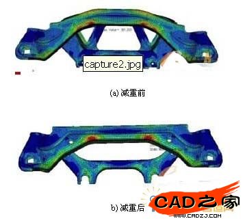 采用圖2所示的CAE流程,對某車型后副車架進行了減重分析,發現BUMP載荷工況對該副車架影響最大(副車架橫梁出現較大應力等),通過基于應力約束的拓撲優化分析,綜合考慮各載荷工況的影響程度,及副車架連接位置不變的設計約束,將該副車架的前后橫梁作為拓撲優化設計域,調整BUMP工況的加權值,得到了圖5 所示的拓撲優化結果,圖5中紅色顯示出非設計域及關鍵載荷路徑,應予以保留,因此基于該拓撲優化結果,制定了減重約15%(約2.5Kg)的副車架輕量化方案,減重前后的模型如圖6所示,進一步驗證了拓撲優化方法在副車架輕量化設計過程中的有效性。