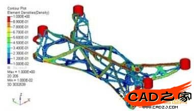 綜合考慮副車架的剛度、強度、重量等SSTS指標,通過設定適當的柔順性目標、質量極小目標及應力約束條件,采用OptiStruct求解,得到了如圖8所示的概念模型,為設計部門提供了新型副車架的設計思路。