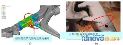 載荷工況1~22基于慣性釋放法采用線性分析,工況23~26采用非線性強度分析。CAE分析發現,該前副車架控制臂安裝支架附近應力偏高,與臺架試驗破壞部位吻合,如圖4所示。說明本文建立的CAE模型精度較高,載荷工況選取適當,可以較為準確的預測副車架的強度薄弱部位,快速找出影響副車架強度的載荷工況,為改進設計提供理論依據。