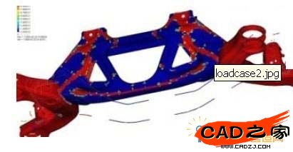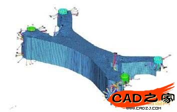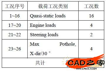 采用圖2給出的CAE分析流程,基于26個載荷工況(見表1),通過ADAMS提取出連接點載荷,對某車型前副車架進行了強度評價分析。有限元模型如圖3所示,共計61739個單元。