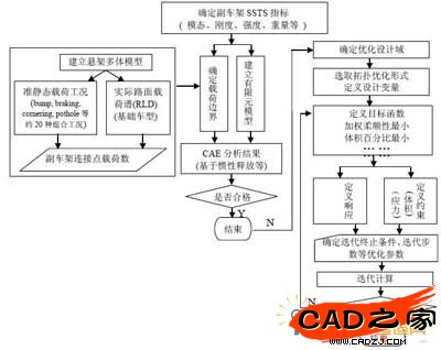 在開展副車架剛度、強度CAE分析的基礎上,結合拓撲優化方法,建立了副車架結構優化CAE流程,主要包括副車架SSTS指標確定階段、基于懸架車輛動力學分析的載荷分解階段、CAE建模階段、剛度強度評價分析階段、及拓撲優化分析階段,如圖2所示。可根據副車架的設計變更情況,對該分析流程進行有效組合,以適應副車架在概念設計或詳細設計階段開展的結構優化工作。
