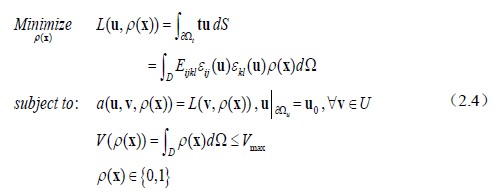 為應變場,ρ(x)表示點x處材料的密度,ρ(x)=x表示該處為實體材料,ρ(x)=0表示該處為空心材料;L(u,ρ(x))為拓撲結構的整體柔順性; a(u,v,ρ(x))為優化構型的平衡方程,