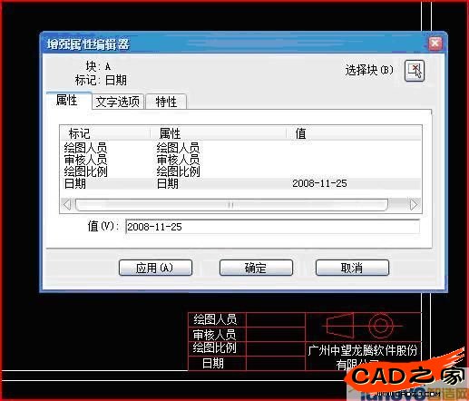 我們將繪制好且定義好屬性的圖樣進行寫塊的操作,名稱根據自己的需要定制。如果需要填寫內容,只需雙擊這個塊就能調出超級屬性塊的窗口,在里可以直接添加內容,如圖5所示。