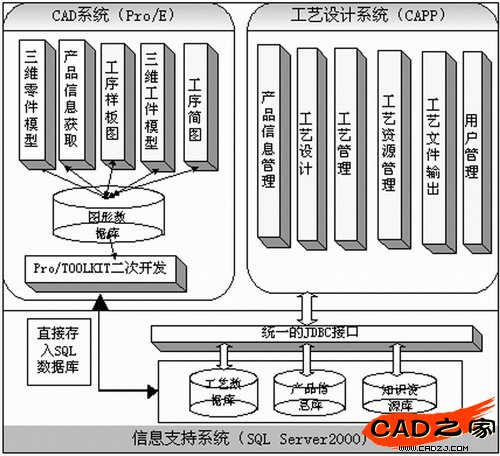 CAD/CAPP集成系統總體框架如圖4所示。主要分成三大子系統。