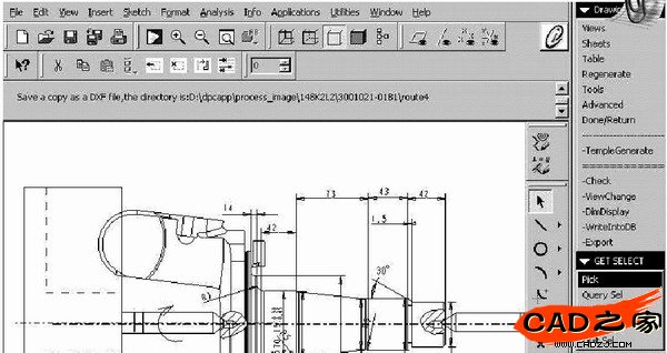 圖5、6表示從CAD系統到CAPP系統的集成過程。首先通過Pro/ENGINEER的二次開發自動生成工序圖,然后輸出為DXF格式,該DXF格式的文件能夠被CAPP系統的JAVA程序自動調用,從而實現了一種異構平臺的圖形數據共享。下面是該工序圖生成系統的一些特點。