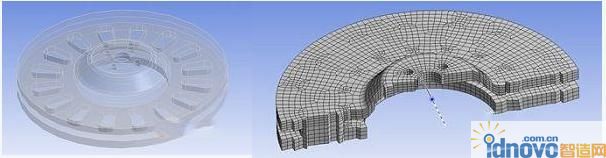 R12.0提供的自動網格劃分解決方案在流體動力學中取得了很好的結果。應用GAMBIT和TGrid的網格附加功能,R12.0可以在用戶最少的輸入下自動生成CFD合適的四面體網格。另外,它融合了高級尺寸函數(與GAMBIT相似)、棱柱及四面體網格(來自TGRID)及其他網格劃分技術,改進了網格平滑度、網格質量、劃分速度、曲率近似功能捕捉、邊界分層捕捉等功能。盡管許多功能是出于流體動力學的應用而改進的,但是它們仍然可以用于其他仿真分析應用。如結構分析的用戶可以應用這些功能,得到自動化和高質量的網格。新增多區域網格劃分方法使用戶在不進行幾何分割的情況下,可以對復雜的幾何模型劃分純六面體網格,圖4為對制動器轉子執行一次操作所得到的六面體網格。