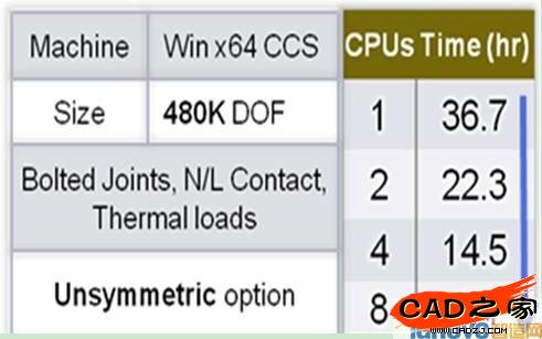 R12.0改善了求解器性能,新增一個新的模態求解器,稱為SNODE,用于求解大模型(超過100萬自由度)的大數量振型(幾百階振型)。并行求解器DANSYS的功能也進行了改進,支持低頻電磁分析、高頻電磁分析、PSTRESS、PSOLVE及循環對稱分析,可以有效的解決電磁問題、轉子動力學問題及循環對稱和應力強化問題,節約求解時間,圖7為所用并行數目對求解時間的影響。