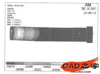 主軸前端施加x、y、z方向銑削力,后端施加y方向的帶傳動(dòng)張力,經(jīng)ANSYS軟件運(yùn)算處理,可得到主軸應(yīng)力及應(yīng)變?cè)茍D,其應(yīng)力分布如圖3所示。主軸前端最大變形為0.022mm,最大應(yīng)力在前端軸承處,最大應(yīng)力為0.0617×109Pa,遠(yuǎn)小于軸的屈服強(qiáng)度。