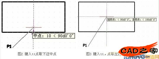 2)再次鍵入tt回車,指定臨時(shí)追蹤點(diǎn)為矩形右邊中心點(diǎn),出現(xiàn)水平對(duì)齊線,沿線左移光標(biāo)到第一個(gè)臨時(shí)追蹤點(diǎn)的上方。如圖3所示。