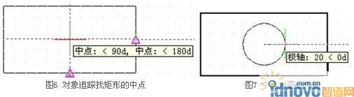 分析解決:關(guān)鍵是繪制圓時(shí)如何快速地拾取圓心到矩形的幾何中心,與上面相似,采用兩邊上的中點(diǎn)對(duì)象追蹤即可,如圖6、圖7所示。