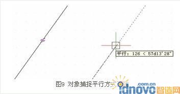 分析解決:對(duì)象捕捉設(shè)置中鉤選平行方式,鍵入Line命令或者單擊圖標(biāo) ,點(diǎn)擊已知點(diǎn)作為直線L2的起點(diǎn),鼠標(biāo)移動(dòng)到直線L1上晃動(dòng)一下,在直線L1上出現(xiàn)一個(gè)小的平行圖標(biāo),鼠標(biāo)右移,從已知點(diǎn)出現(xiàn)一條對(duì)象捕捉虛線(平行對(duì)齊線),如圖9所示,沿此對(duì)齊線就可作出要求平行的直線L2。