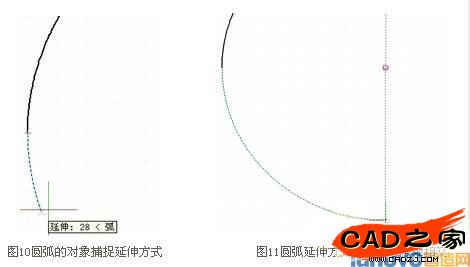 對(duì)象捕捉追蹤應(yīng)用是廣泛的,只是一些人沒有利用起來,對(duì)象捕捉與對(duì)象捕捉追蹤結(jié)合使用,更能體會(huì)到其優(yōu)越性。圖10是利用對(duì)象捕捉的延伸線來進(jìn)行圓弧的延伸方式捕捉,圖11則是圓弧延伸方式與過圓心極軸相交。中望CAD2006的延伸捕捉、平行捕捉和捕捉自功能都能與自動(dòng)追蹤系統(tǒng)相輔相成,為我們提供了強(qiáng)大的捕捉、追蹤系統(tǒng)。